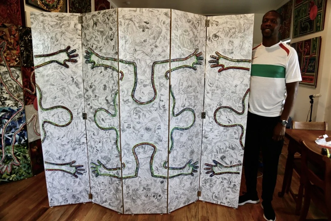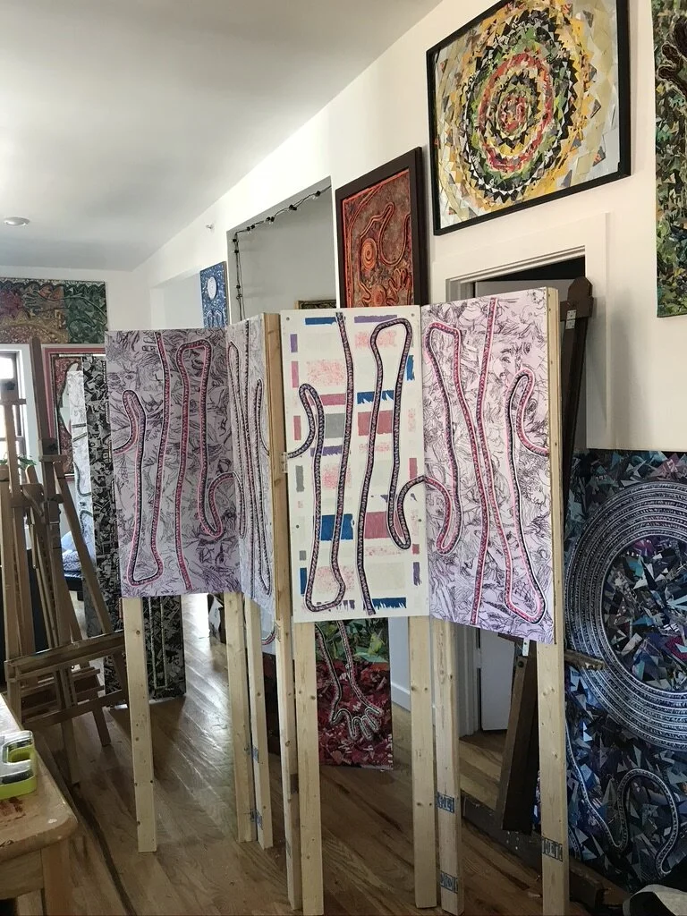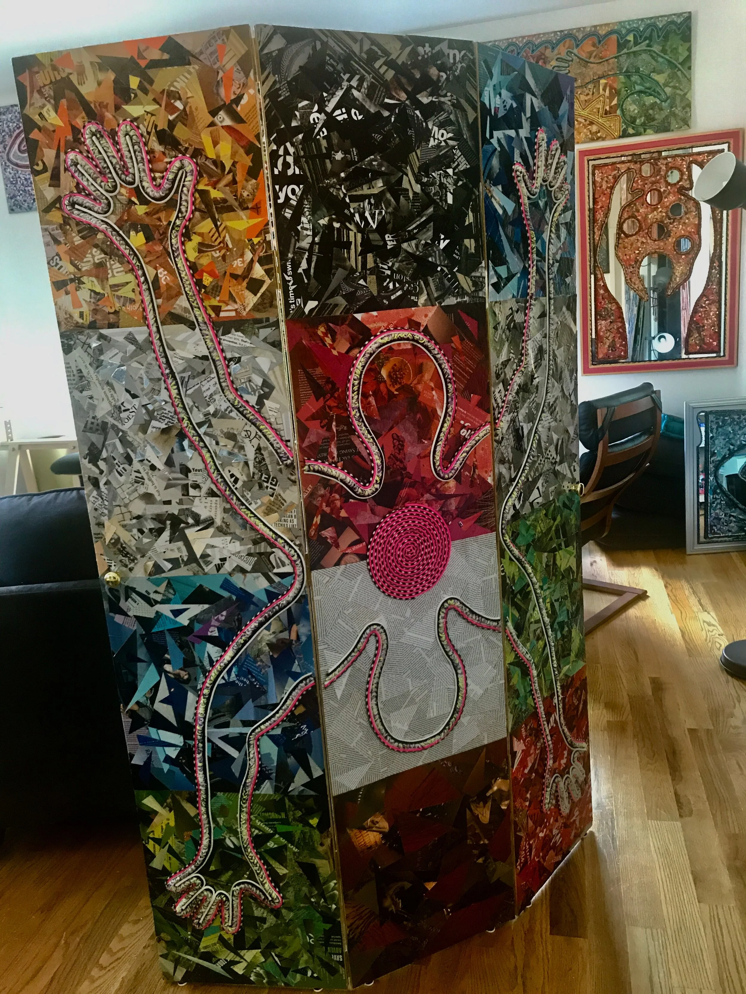 This is the first screen made with legs and it is shaping up to be an elegant and graceful standing art piece. It is still a work in progress.